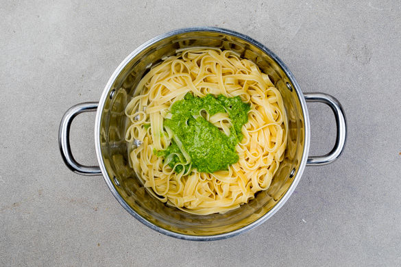 Sobald das Wasser kocht, die Pasta hineingeben und in ca. 9–11Min. bissfest kochen. Die Pasta in ein Sieb abgießen und abtropfen lassen, dabei ca. 1 Tasse Pastawasser auffangen.