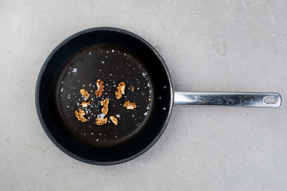 Die halbierten Nüsse in einer kleinen Pfanne ohne Zugabe von Fett bei mittlerer Hitze ca. 2–3Min. anrösten. Aus der Pfanne nehmen, mit 1 Prise Salz vermengen und beiseitestellen.