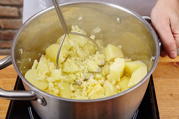 Den Grillofen auf 250°C vorheizen. In einem großen Topf ausreichend leicht gesalzenes Wasser für die Kartoffeln zum Kochen bringen. Die Kartoffeln schälen und in ca. 3cm große Stücke schneiden. Sobald das Wasser kocht, die Kartoffeln hineingeben, erneut kurz aufkochen und dann leicht köchelnd in ca. 10–15Min. weich kochen lassen.