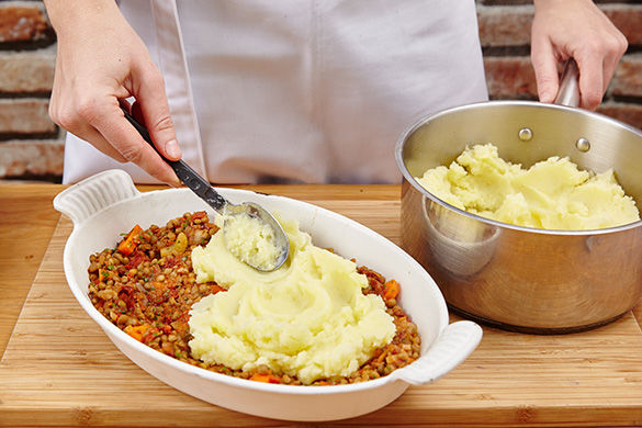 Warum Kartoffelpüree separat essen? Unsere Köchin Hannah wollte mal etwas anderes ausprobieren und hat den cremigen Liebling auf einen fruchtigen Eintopf aus Tomaten, Sellerie und Linsen gestrichen. Darüber kommt Käse – und dann ab in den Ofen, wo sich der Auflauf schick bräunen kann.