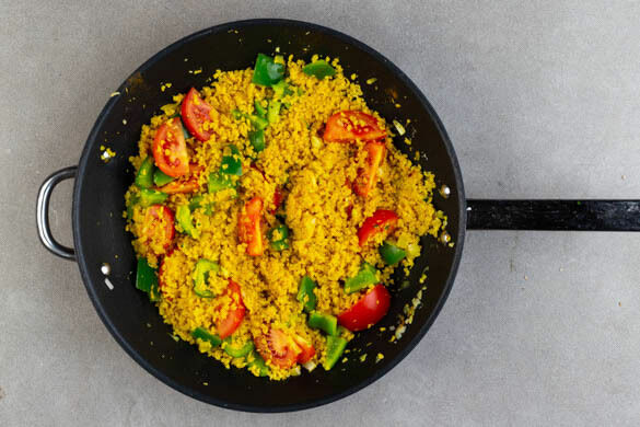Die Paprika mit 1 kräftigen Prise Salz in die Pfanne geben und bei mittlerer bis starker Hitze ca. 3Min. anbraten. Die Korianderstängel, die Kokosraspel und das Currypulver hinzufügen und ca. 1Min. erwärmen. Den Bulgur und die Tomaten zugeben und bei starker Hitze 1–2Min. braten, dabei stetig umrühren. Mit Salz und Pfeffer abschmecken.