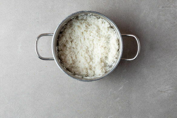 In einem mittelgroßen Topf 600ml leicht gesalzenes Wasser zum Kochen bringen. Den Reis in einem Sieb kalt abspülen, bis das Wasser klar bleibt. Sobald das Wasser kocht, den Reis hineingeben und abgedeckt bei niedrigster Hitze 8–10Min. kochen, bis das Wasser aufgesogen und der Reis gar ist. Noch ca. 5Min. ohne Hitzezufuhr ziehen lassen.