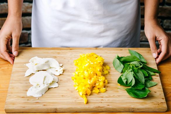 Den Mozzarella in dünne Scheiben schneiden. Die Paprika halbieren, entkernen und in kleine Würfel schneiden. Die Basilikumblätter von den Stängeln zupfen.