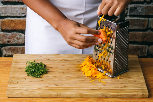 Währenddessen den Kürbis entkernen, in Spalten schneiden und grob raspeln. Die Thymianblätter von den Stängeln streifen.