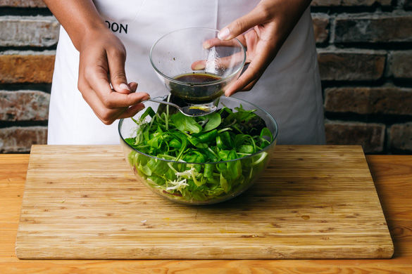 Die Zitrone halbieren und auspressen. Ca. 2EL Zitronensaft mit 1TL Senf, 3–4EL Olivenöl und 1 Prise Zucker verrühren, mit Salz und Pfeffer abschmecken. Den Rucola mit dem Dressing vermengen. Die Quiche mit den Zwiebeln garnieren und den Salat dazu servieren.
