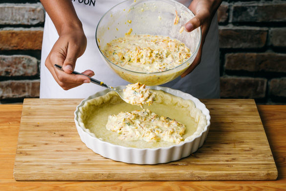 Den Backofen auf 210°C Umluft (230°C Ober-/Unterhitze) vorheizen. Eine runde Quicheform mit dem Quicheteig auskleiden, überstehenden Teig ggf. entfernen. Mit Backpapier und Reis oder anderen trockenen Hülsenfrüchten als Backgewicht bedecken und ca. 10–12Min. im Ofen vorbacken, Backpapier und Backgewicht anschließend entfernen.
