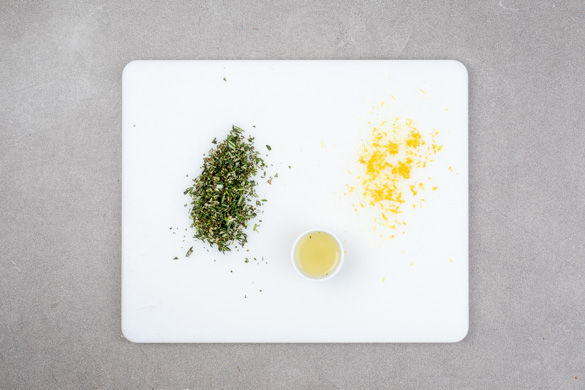 Die Thymianblättchen und die Rosmarinnadeln von den Stängeln zupfen und fein hacken. Die Zitronenschale abreiben, dann die Zitrone halbieren und auspressen.