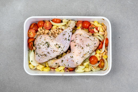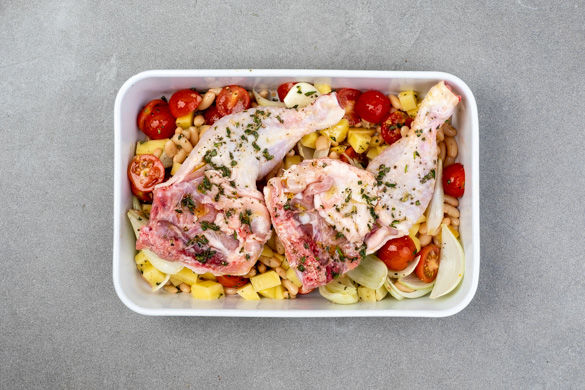 Aromatische Düfte von Thymian und Rosmarin durchziehen deine Wohnung, wenn du die saftigen Hähnchenschenkel auf einer mediterran gewürzten Gemüsemischung aus Kartoffeln, Tomaten und weißen Bohnen garst. Für die Zubereitung musst du nicht viel Geschirr schmutzig machen, und während alles im Ofen ist, kannst du dich schon mal deinem entspannten Feierabend hingeben.