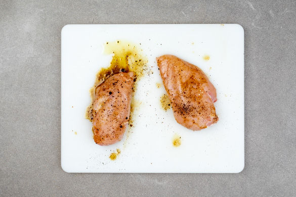 Das Fleisch mit etwas Küchenkrepp trocken tupfen. Ca. 1–2TL Ras el-Hanout mit 2–3EL Olivenöl, Salz und Pfeffer verrühren und das Fleisch damit einreiben. Das überschüssige Gewürzöl beiseitestellen.