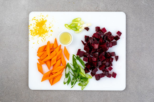 Die Karotten schälen, längs halbieren und schräg in ca. 1,5cm dicke Scheiben schneiden. Die 1/2 der Roten Bete in ca. 1cm große Würfel schneiden. Die Lauchzwiebel quer halbieren, den weißen und den grünen Teil separat in schräge, feine Ringe schneiden. Die Zitronenschale abreiben, dann die Zitrone halbieren und auspressen.