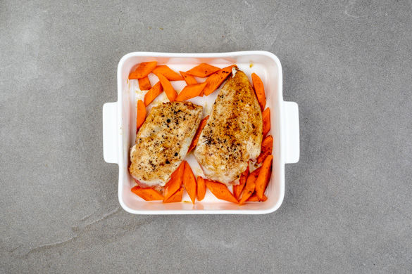 Die Karotten in einer Auflaufform mit dem restlichen Gewürzöl vermengen und ca. 15–20Min. im Ofen backen, dabei nach der Hälfte der Zeit einmal wenden. Das Fleisch in einer großen Pfanne bei starker Hitze von jeder Seite ca. 1–2Min. scharf anbraten. In die Auflaufform zu den Karotten geben und ca. 8–12Min. garen, bis das Fleisch in der Mitte durch ist.