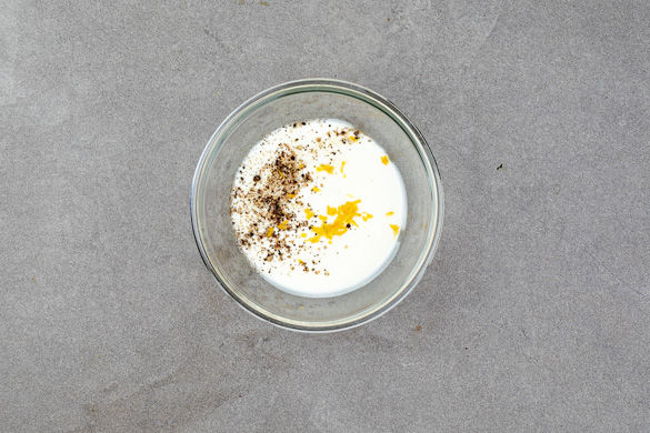 Den Joghurt mit Salz und Pfeffer würzen und mit Zitronenabrieb abschmecken.