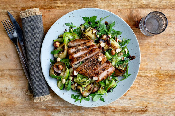 Gebratene Auberginen und Zucchini begleiten als eleganter Salat mit Rucola und gerösteten Haselnüssen das zarte Schweinerückensteak. Mit dem Bratensatz zauberst du eine schnelle Oregano-Balsamico-Sauce, die alles verfeinert. So geht leichte, schnelle Feierabendküche!