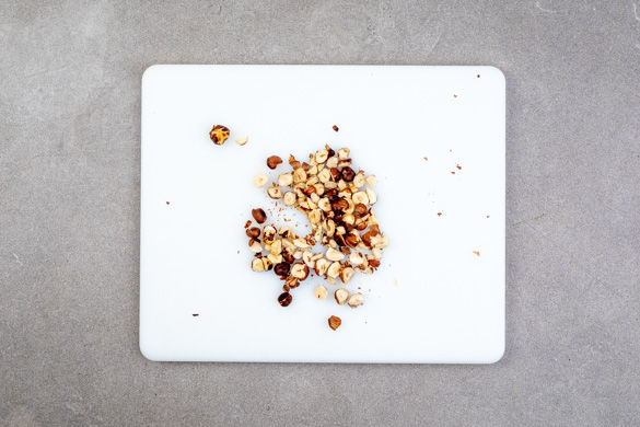 Die Haselnüsse in einer großen Pfanne ohne Zugabe von Fett bei mittlerer HItze anrösten. Vorsicht, die Nüsse können schnell verbrennen! Die Haselnüsse zum Abkühlen aus der Pfanne nehmen und grob hacken.