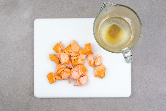 Den Lachs in grobe Stücke zerteilen, dabei auf Gräten achten und ggf. die Haut entfernen. Den Brühwürfel im heißen Wasser auflösen.