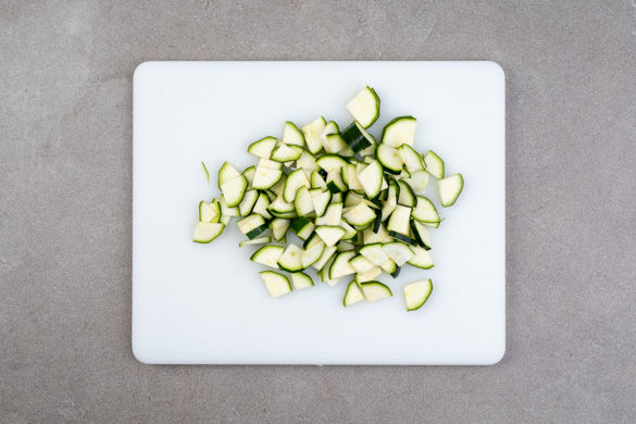 Die Zucchini längs vierteln und in dünne Scheiben schneiden. Für die Brühe 400ml Wasser in einem Wasserkocher zum Kochen bringen.