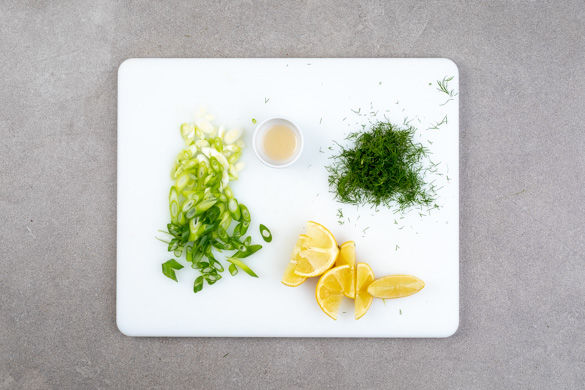 Die Lauchzwiebeln schräg in feine Ringe schneiden. Die Dillspitzen von den Stängeln zupfen und fein hacken. Die Zitrone halbieren, eine Hälfte auspressen, die andere Hälfte in Spalten schneiden.