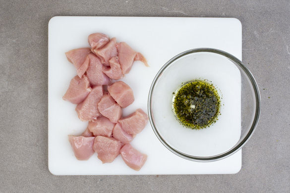 Den Knoblauch schälen und fein hacken. Aus 3–4EL Olivenöl, der Gewürzmischung und ca. 2/3 des Knoblauchs eine Marinade anrühren. Das Fleisch mit etwas Küchenkrepp trocken tupfen, in ca. 2cm große Würfel schneiden und gut mit der Marinade vermengen. Beiseitestellen und ziehen lassen.
