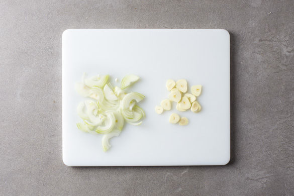 In einem großen Topf ausreichend leicht gesalzenes Wasser für die Pasta zum Kochen bringen. Die Zwiebeln schälen, halbieren und in feine Streifen schneiden. Den Knoblauch schälen und in dünne Scheibchen schneiden.