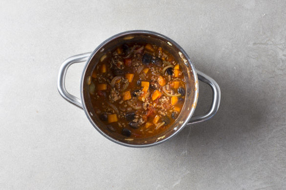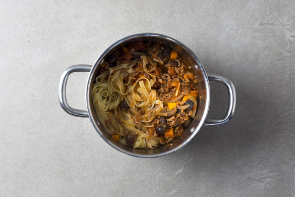 In einem mittelgroßen Topf die Zwiebeln und die Karotten mit 1TL Olivenöl bei mittlerer Hitze 1–2Min. anschwitzen. Dann die Hitze erhöhen, das Hackfleisch hinzugeben und 2Min. scharf braten. Die Oliven und den Knoblauch untermischen und 1Min. mitgaren.