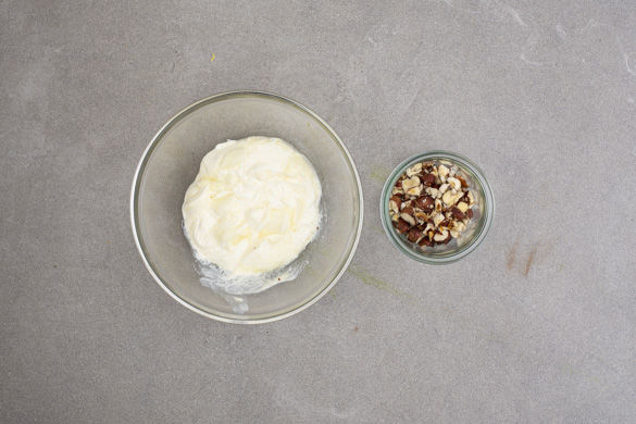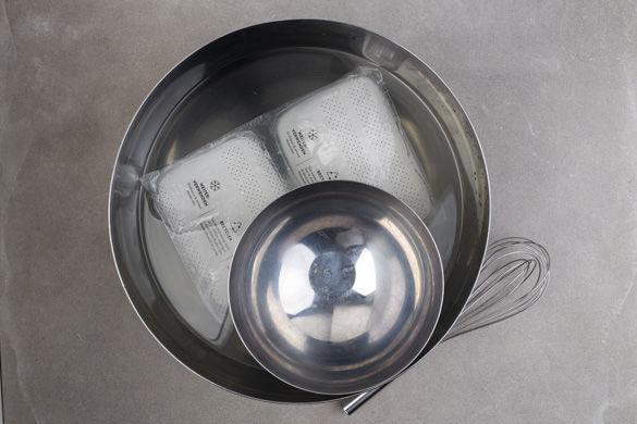 Für das Eisbad eine große Schüssel so mit Eiswürfeln und kaltem Wasser füllen, dass eine kleinere Schüssel in die größere passt, ohne dass das Wasser überläuft. Einen Schneebesen oder ein Handrührgerät sowie Servierschalen bereithalten. Die Minzeblätter von den Stängeln zupfen.