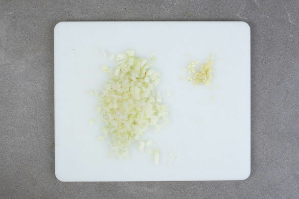 In einem mittelgroßen Topf ausreichend gesalzenes Wasser für die Pasta zum Kochen bringen. Die Zwiebel schälen, halbieren und in kleine Würfel schneiden. Den Knoblauch schälen und ebenfalls fein würfeln.