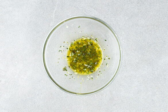 Den Backofen auf 220°C (200°C Umluft) vorheizen. Den Knoblauch schälen und fein würfeln. Die Thymianblätter abstreifen. Die Zitronenschale abreiben, dann die Zitrone halbieren und auspressen. Den Knoblauch, den Thymian, 1TL Zitronenschale und 1EL Zitronensaft mit 1EL Olivenöl verrühren. Mit Salz und Pfeffer würzen.