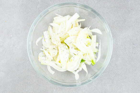Inzwischen den Fenchel längs halbieren und in dünne Scheiben schneiden. Das Fenchelgrün für die Garnitur beiseitelegen. Den Fenchel mit dem restlichen Zitronensaft sowie je 1 Prise Salz und Pfeffer mischen.