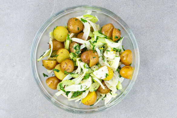 Den Sellerie in feine Scheiben schneiden. Die Petersilie samt Stängeln fein hacken. Die Kartoffeln , den Fenchel, den Sellerie, die Petersilie und 1EL Olivenöl vermengen, dann den Bratensaft aus der Auflaufform untermischen. Das Fleisch in Tranchen schneiden, mit dem Lauch auf dem Kartoffel-Salat anrichten und mit dem Fenchelgrün garniert servieren.