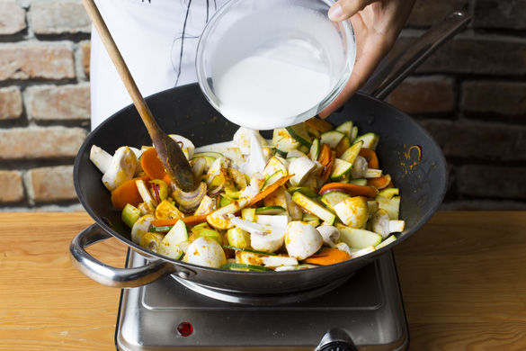 Die Pilze und die Zucchini in die Pfanne geben und alles mit 50ml Wasser und der Kokosmilch ablöschen. Den Brühwürfel im Curry auflösen und mit Salz und Pfeffer abschmecken. Das Curry 10–15Min. abgedeckt köcheln. Wer das Gemüse nicht so knackig mag, kocht es weitere 5Min. Die letzten 5Min. der Kochzeit die grünen Pak-Choi-Stücke hinzufügen.