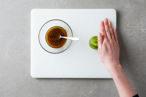 Die Knoblauch-Ingwer-Paste mit der restlichen Sojasauce, dem restlichen Sesamöl, ½TL Zucker und 3–4EL Wasser verrühren. Die Limettenschalen abreiben, dann die Limetten halbieren und auspressen. Tipp: Die Limette vor dem Auspressen mit etwas Druck auf der Arbeitsfläche rollen, danach lässt sie sich leichter auspressen.
