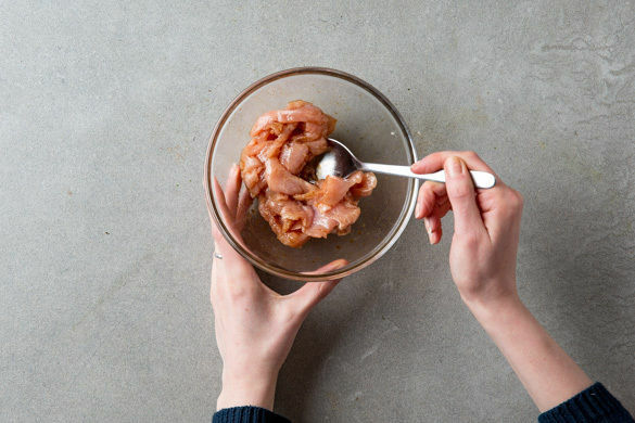 In einem mittelgroßen Topf ausreichend gesalzenes Wasser für die Nudeln zum Kochen bringen. Die ½ der Sojasauce mit 1TL Sesamöl und 1 Prise Salz verrühren. Das Fleisch trocken tupfen und mit der Marinade vermengen. Bis zur weiteren Verwendung beiseitestellen.
