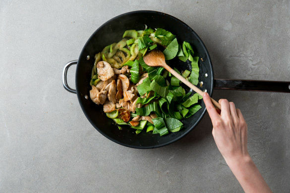 Den Pak Choi in 1–2cm breite Streifen schneiden, dabei die weißen und grünen Teile voneinander trennen und beiseitelegen. Die Lauchzwiebel schräg in feine Streifen schneiden. Den Stangensellerie in ca. 0,5cm dünne, schräge Streifen schneiden.