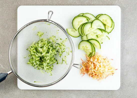 Den Backofen auf 220°C (200°C Umluft) vorheizen. Die Gurke längs halbieren und eine Hälfte quer in dünne Scheiben schneiden, die andere Hälfte in ein Sieb raspeln. Mit den Händen möglichst viel Flüssigkeit aus den Gurkenraspeln drücken. Den Apfel halbieren, dann eine Hälfte ebenfalls grob raspeln, die andere Hälfte wird für dieses Rezept nicht benötigt.