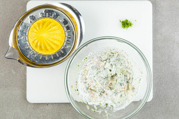 Die Limettenschale abreiben, dann die Limette halbieren und auspressen. Den Joghurt mit den Gurken- und den Apfelraspeln, 1TL Limettensaft sowie 2TL Minze verrühren. Die Raita mit Salz und Pfeffer abschmecken.