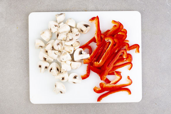 Die Pilze ggf. mit etwas Küchenkrepp oder einer Bürste säubern und je nach Größe halbieren oder vierteln. Die Paprika vierteln, entkernen und in feine Streifen schneiden. In einem mittelgroßen Topf ausreichend leicht gesalzenes Wasser für die 1/2 der Nudeln zum Kochen bringen.