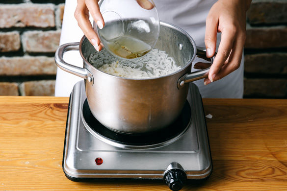 600ml leicht gesalzenes Wasser in einem mittelgroßen Topf zum Kochen bringen. 3/4 des Reises in einem Sieb unter fließendem Wasser abspülen. Den Reis in das kochende Wasser geben und abgedeckt bei niedrigster Hitze ca. 10–12Min. kochen, bis das Wasser aufgesogen und der Reis gar ist. Noch ca. 5Min. ohne Hitzezufuhr abgedeckt ziehen lassen.