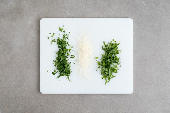 Die Basilikumblätter abzupfen und grob hacken. Die Petersilienblätter ebenfalls von den Stängeln zupfen und grob hacken. Den Käse fein reiben.