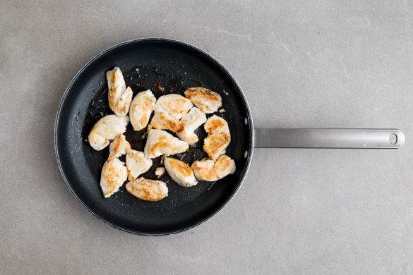 Das Hähnchen mit etwas Küchenkrepp trocken tupfen, in ca. 1–2cm dünne Scheiben schneiden und mit Salz und Pfeffer würzen. Das Fleisch in einer großen Pfanne mit 1EL Olivenöl auf höchster Stufe ca. 2–3Min. scharf anbraten, dann aus der Pfanne nehmen und auf einem Teller beiseitestellen. Die Pfanne aufbewahren.