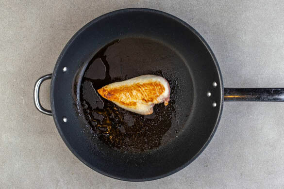 In einem mittelgroßen Topf ausreichend gesalzenes Wasser für die Pasta zum Kochen bringen. Das Fleisch trocken tupfen, mit 1 kräftigen Prise Salz würzen und in einer großen Pfanne mit 2EL Olivenöl bei starker Hitze auf jeder Seite ca. 3Min. goldbraun anbraten. Das Fleisch aus der Pfanne nehmen und abgedeckt auf einem Teller ruhen lassen, die Pfanne wird weiterverwendet.