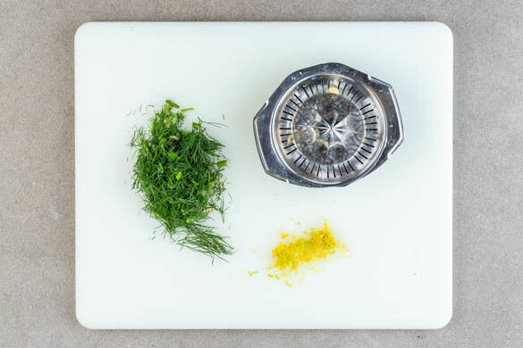 Den Dill samt Stängeln fein schneiden. 1TL Zitronenschale abreiben, dann die Zitrone halbieren und eine Hälfte auspressen.