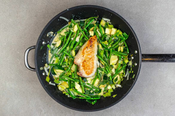 Den Lauch längs halbieren und in quer in feine Streifen schneiden. Die Zucchini längs vierteln und in 1–2cm große Würfel schneiden. Die Enden der grünen Bohnen entfernen. Den Lauch, die Zucchini und die grünen Bohnen in der Pfanne mit 2EL Olivenöl bei mittlerer bis starker Hitze 6–8Min. braten.