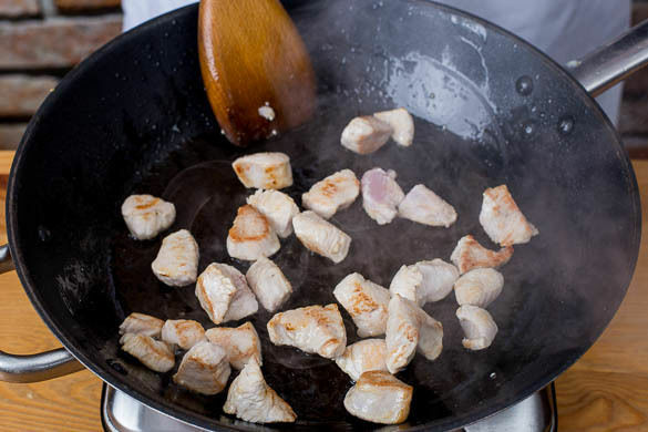 Das Fleisch in einer großen Pfanne oder einem Wok mit 2EL Pflanzenöl bei starker Hitze rundum 2–3Min. goldbraun anbraten.