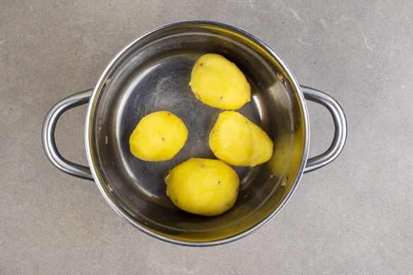 Den Backofen auf 180°C Umluft (200°C Ober-/Unterhitze) vorheizen. In einem mittleren Kochtopf ausreichend leicht gesalzenes Wasser zum Kochen bringen und die Kartoffeln darin in 15–20Min. kochen. Tipp: Die Kartoffeln sind durch, wenn sie sich bei der Messerprobe leicht vom Messer lösen. Die Kartoffeln in ein Sieb abgießen, kurz abkühlen lassen und pellen.