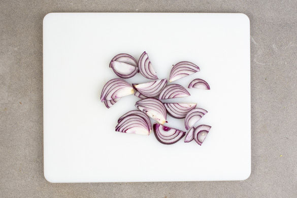 Die Zwiebel schälen, halbieren und in feine Streifen schneiden.