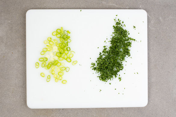 Die Petersilienblätter vom Stiel zupfen und fein hacken. Die Lauchzwiebel in feine Ringe schneiden.