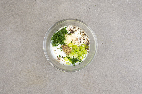 Den Joghurt mit der Mayonnaise, dem Senf, der 1/2 der Petersilie und den Lauchzwiebeln zu einer Remoulade verrühren und mit Salz und Pfeffer abschmecken.