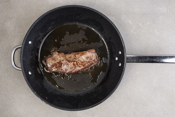 Das Fleisch in einer mittelgroßen, ofenfesten Pfanne mit 1EL Olivenöl bei starker Hitze ca. 2–3Min. rundum scharf anbraten, dann 5–7Min. im Ofen garen, bis das Fleisch gar, aber in der Mitte noch rosa ist. Das Fleisch mit Salz und Pfeffer würzen, in dünne Tranchen aufschneiden und mit den Bratkartoffeln und der Remoulade servieren.