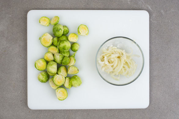 Vom Rosenkohl den Strunk abschneiden, die äußeren Blätter entfernen und den Rosenkohl halbieren. Die Zwiebel schälen, halbieren und in dünne Halbringe schneiden. Die Zwiebelringe voneinander trennen und in ca. 1EL Mehl wenden.