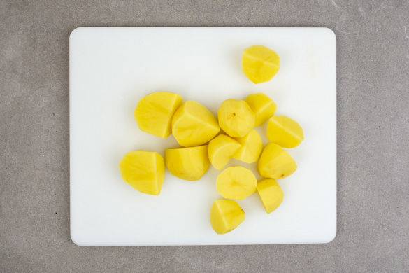 Den Backofen auf 200°C Umluft (220°C Ober-/Unterhitze) vorheizen. In einem mittelgroßen Topf ausreichend leicht gesalzenes Wasser für die Kartoffeln zum Kochen bringen. Die Kartoffeln schälen und je nach Größe vierteln oder halbieren.